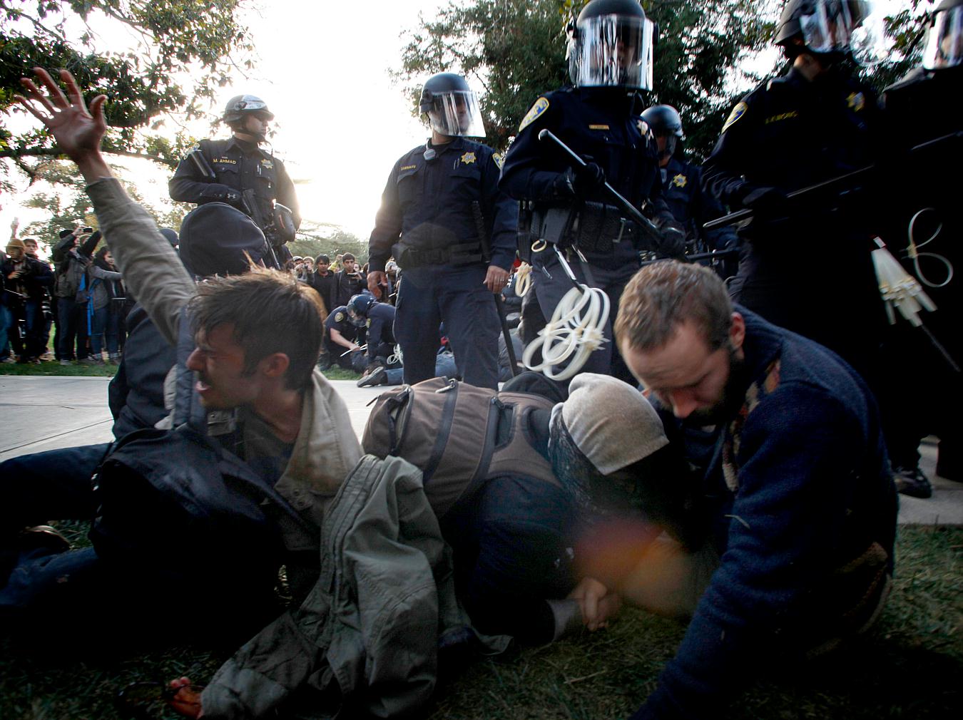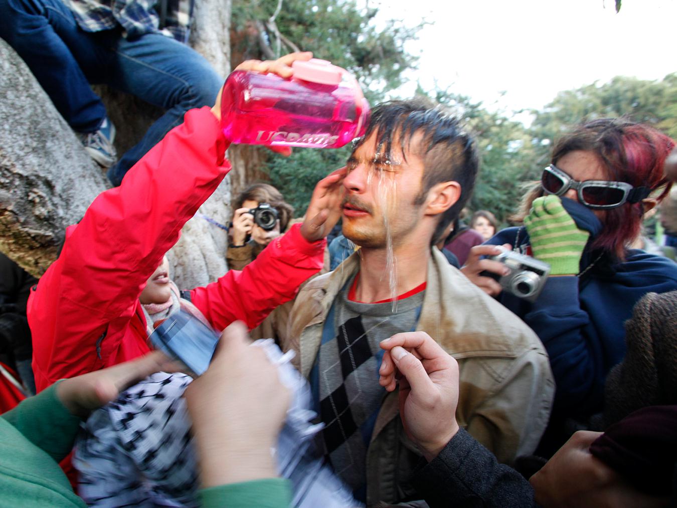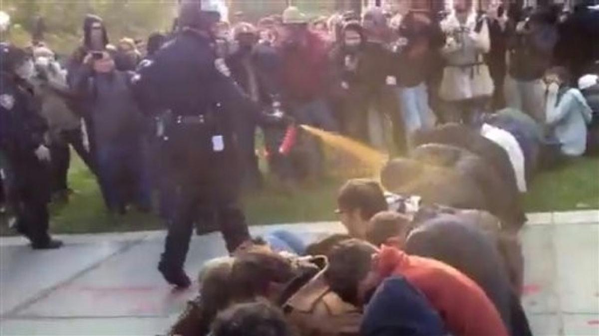 backwardIn this Friday, Nov. 18, 2011, photo University of California, Davis Police Lt. John Pike uses pepper spray to move Occupy UC Davis protesters while blocking their exit from the schoolIn this Friday, Nov. 18, 2011, photo Occupy University of California, Davis, protesters including David Buscho, far left, react after being pepper sprayed by police who came to remove tents set up on the schoolthis Friday, Nov. 18, 2011, photo occupy protester David Buscho is helped after being pepper sprayed by campus police while blocking their exit from the schoolPolice help clearing the area...forward