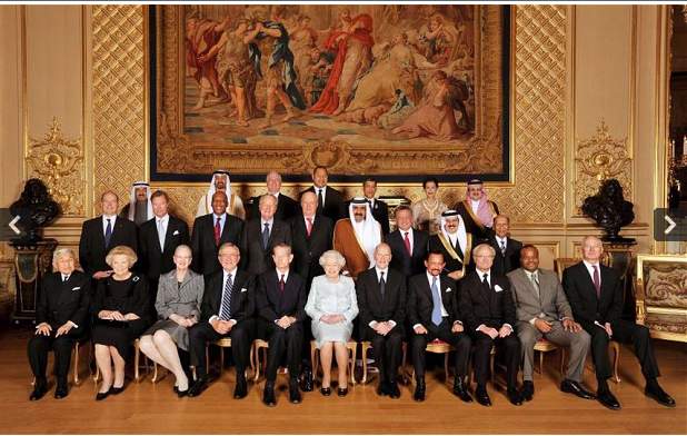 A variety of tyrants and pretenders. Queen Elizabeth II with her royal guests pose for a picture before her Sovereign Monarchs Jubilee lunch in the Grand reception room at Windsor Castle Photo: AP