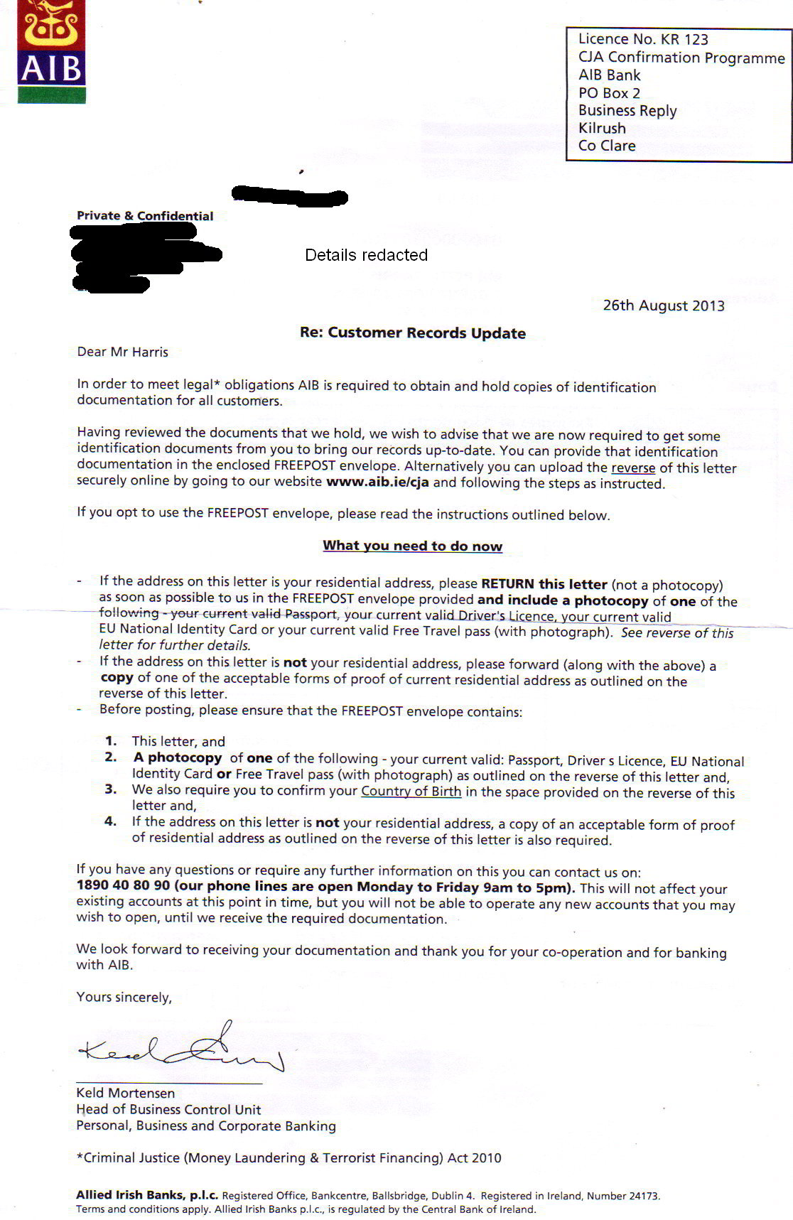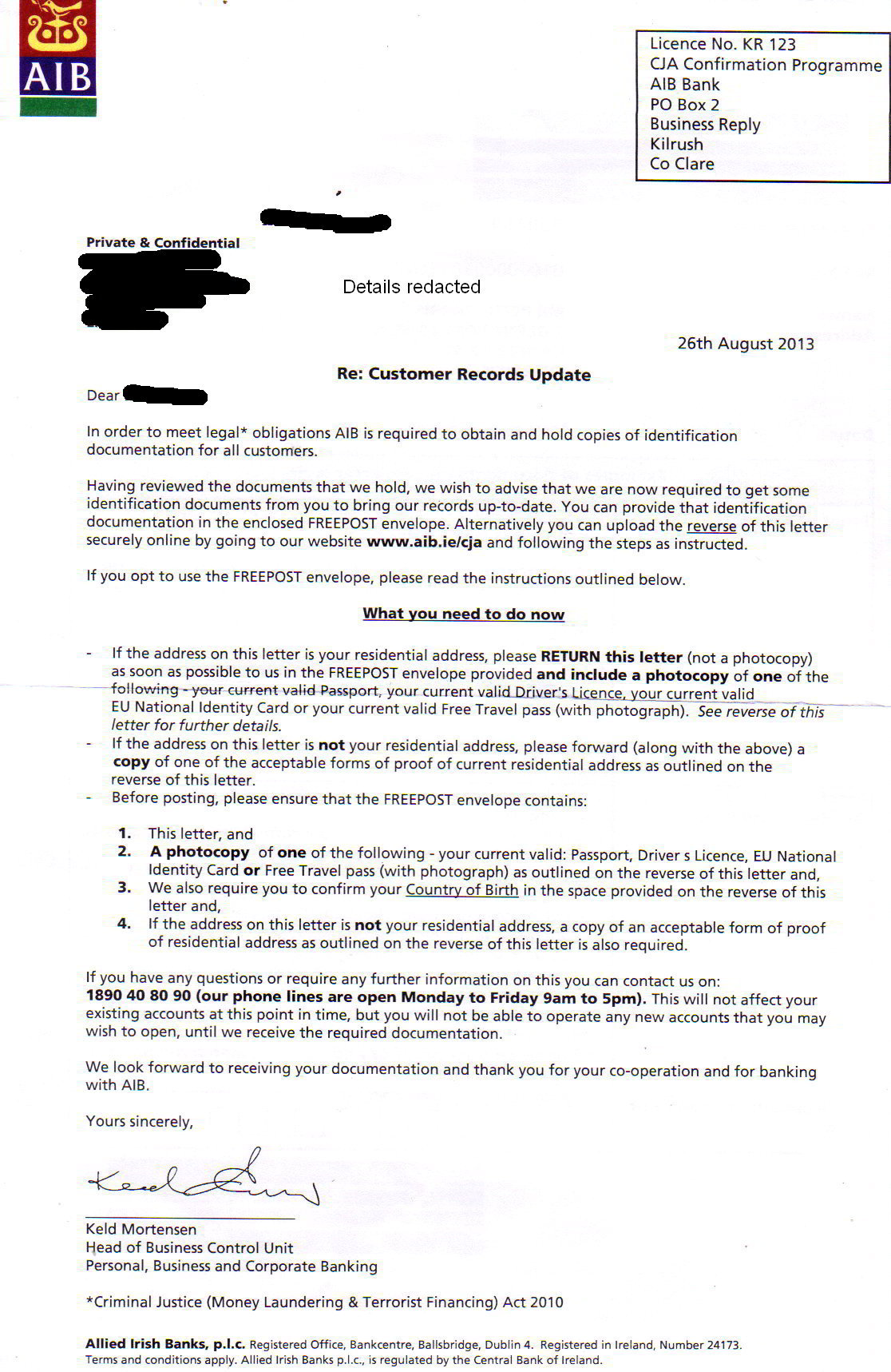 This morning I received the attached letter from AIB requesting that I provide 'proof' of my identity.
