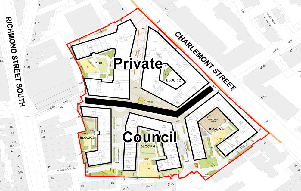 Jump To Comment: 1 2 3 4 5 6The red line indicates the spatial circumference in which Tom Kelly Flats lay situated today. The visible blocks are the proposed plans, and black line in the middle indicates the dividing line in what will inevitably be between private property and the middle class on one side, and the working class on the other.