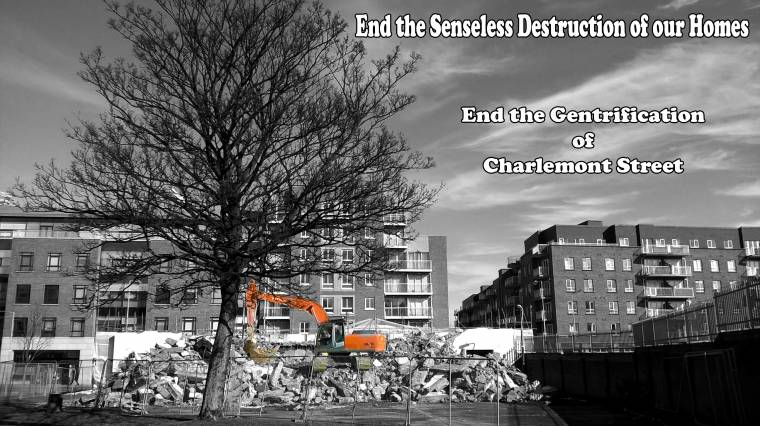 This image here clearly exemplifies the ongoing gentrification process in Charlemont Street. While the digger clears up what's left of a one time social housing unit block of flats, the massive private office block on the left, and middle-class-filled private apartments on the right, can now be seen encroaching the entire community.