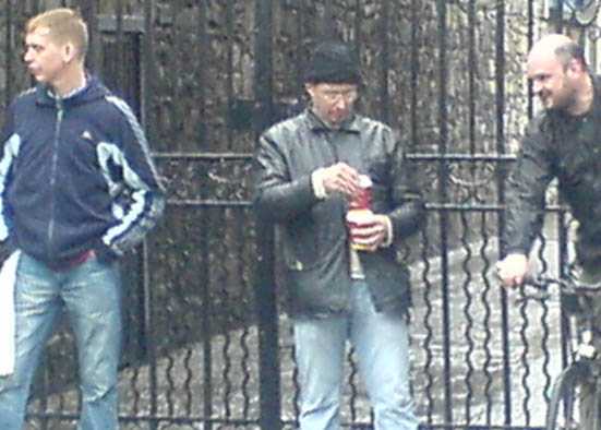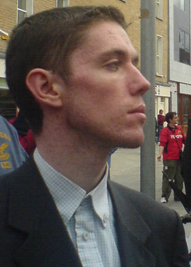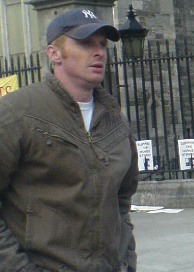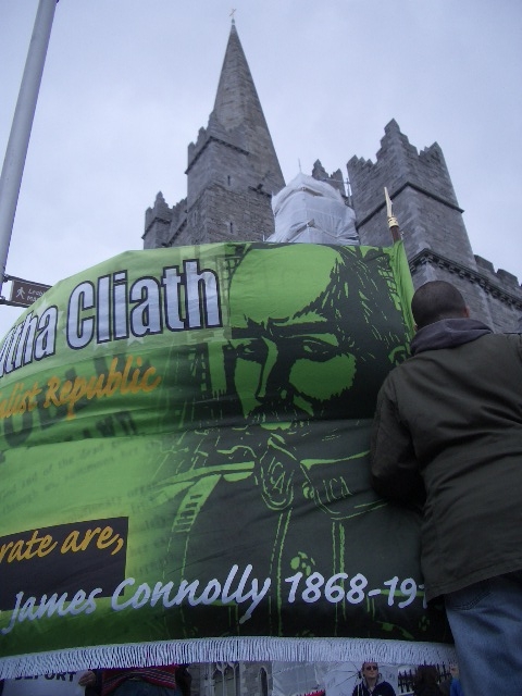 The one in the dark glasess and the skinhead outfit was wearing two pins, an easter lily and the map of Ireland with the four provinces. Connolly must be turning around in his grave