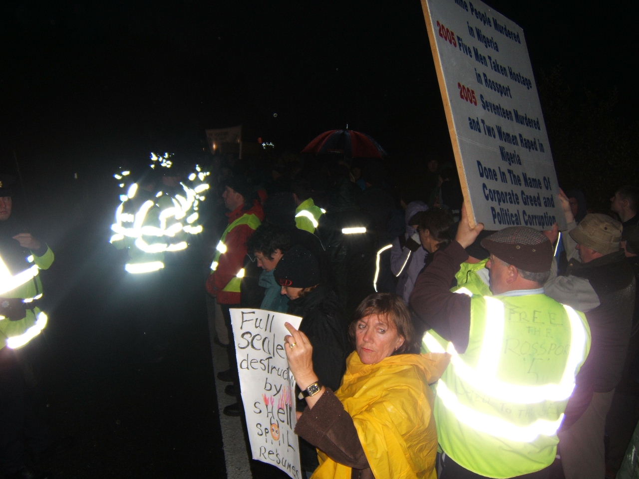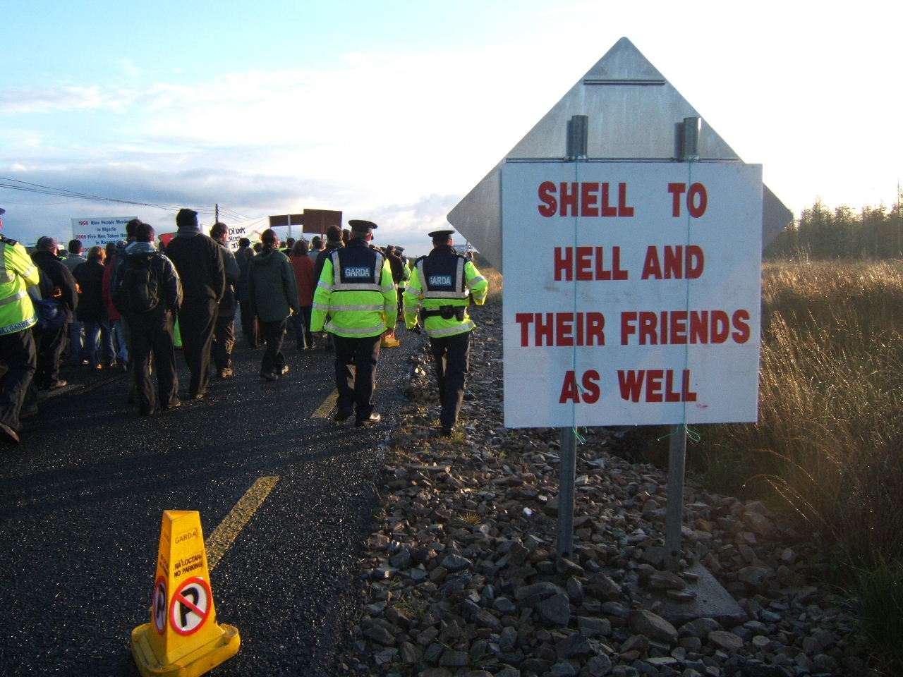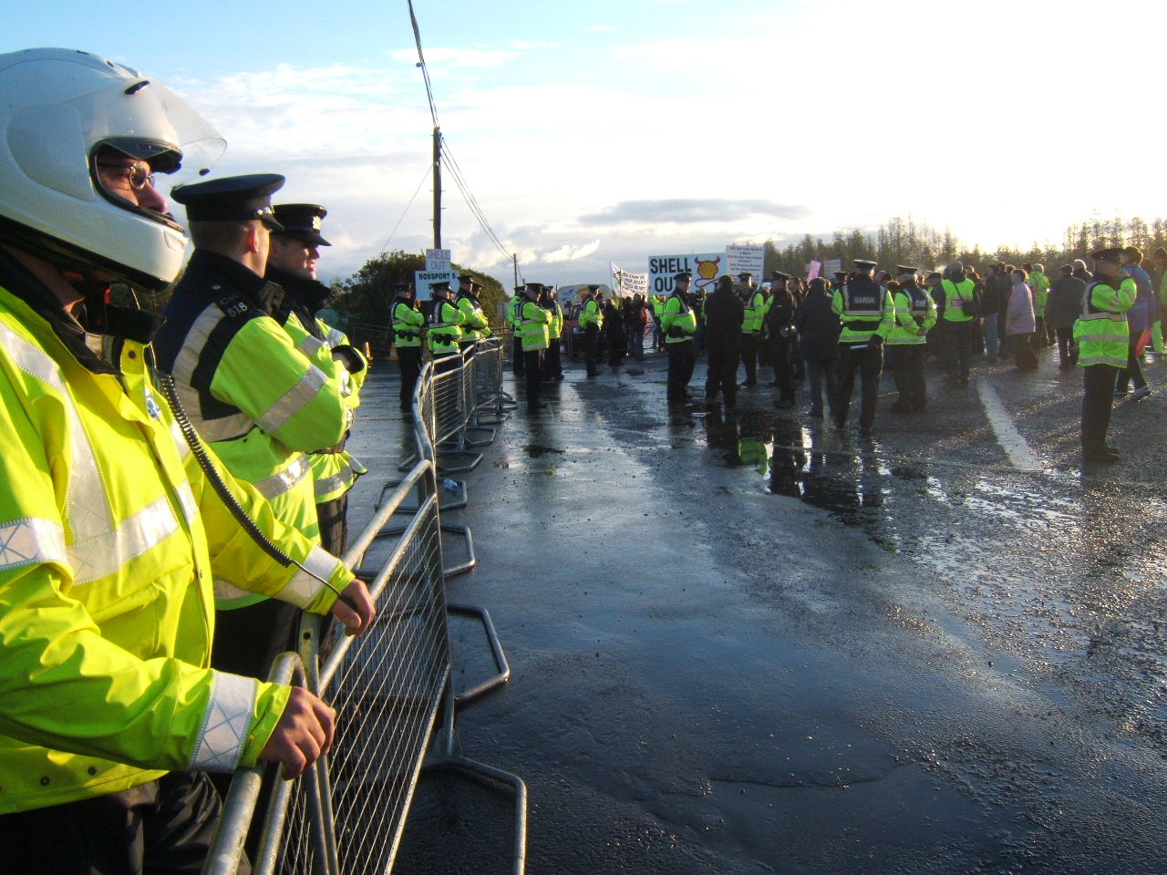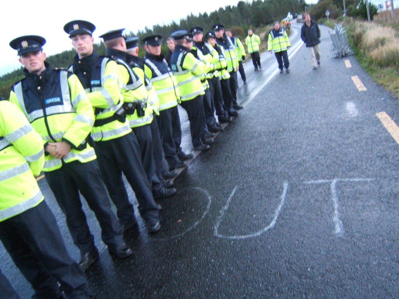 The effective occupation of the Bellanaboy area by police since Tuesday morning continues. Hundreds of Gardaí who have been drafted into the small community to facilitate Shell’s work remain in the area and have maintained a strong presence outside the proposed refinery site since then. In the same way that Nigeria’s “oil police” violently suppress dissent to Shell’s corporate rape, the Gardaí are effectively Shell’s state provided private army protecting the global giant from the community which it is attempting to destroy. Public roads have been blocked and Garda checkpoints erected. Wednesday morning’s protest witnessed a heavy police presence with luminous coated Gardaí lining the roadside. This morning police presence was more low-key with Gardaí waiting on standby in buses.