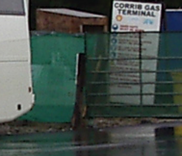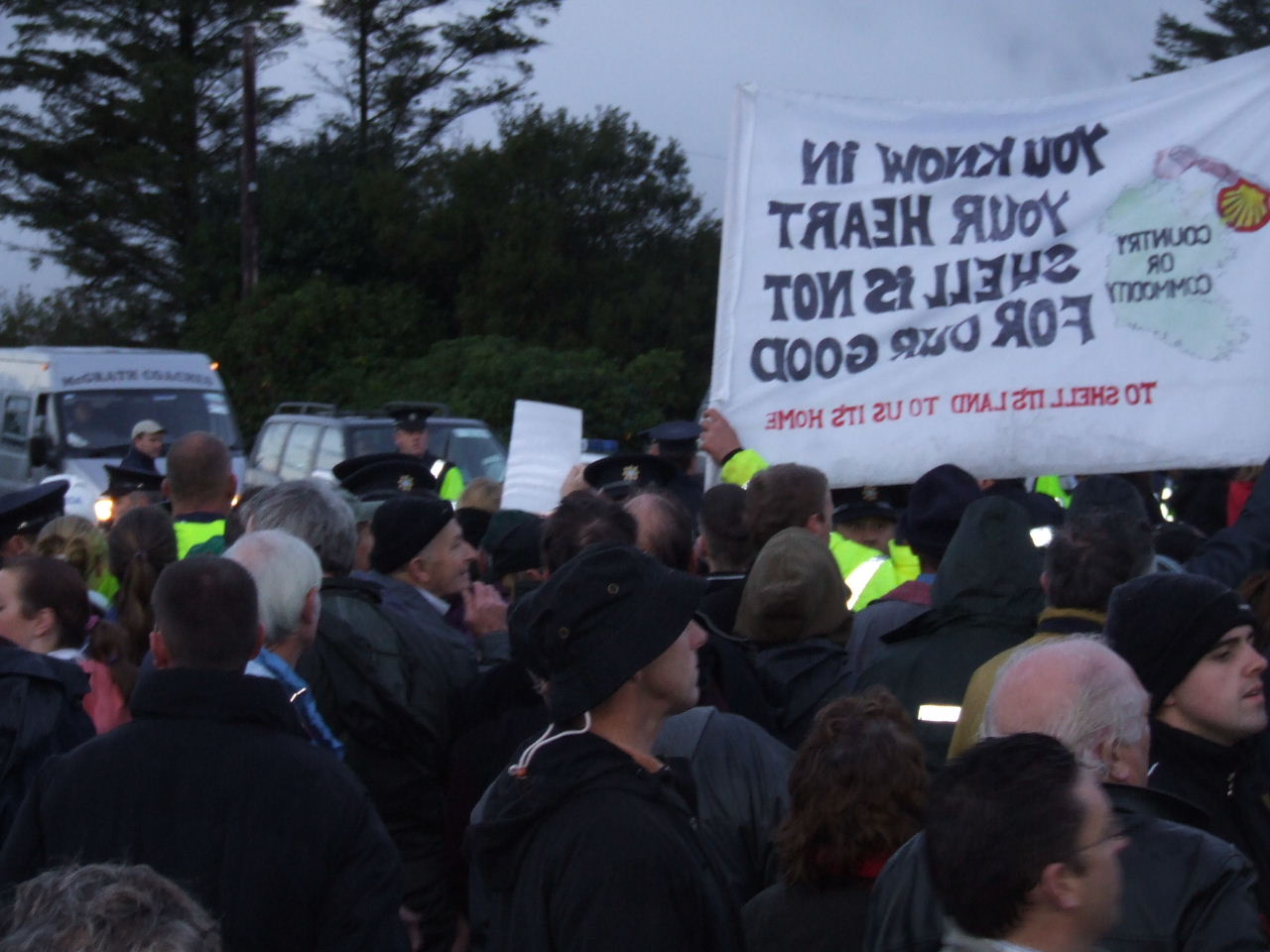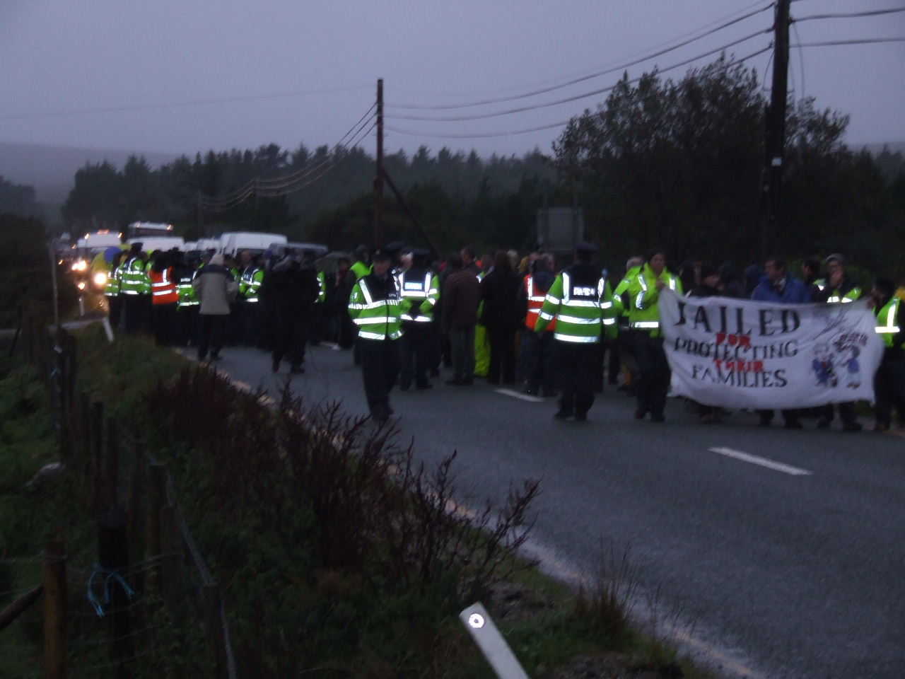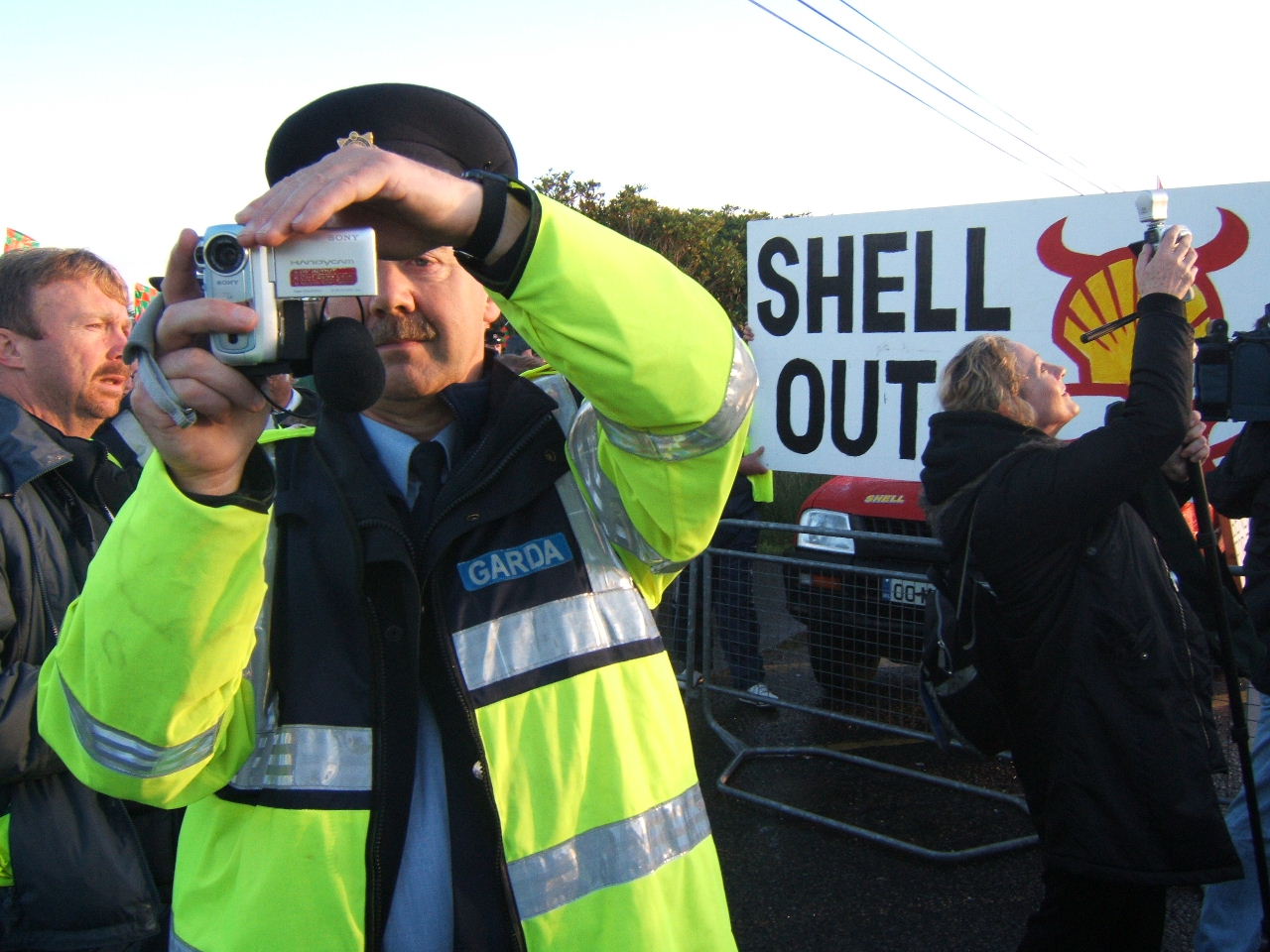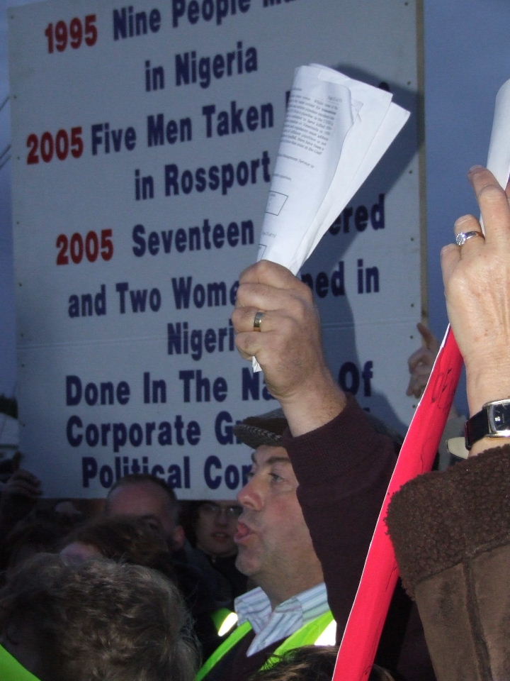 The effective occupation of the Bellanaboy area by police since Tuesday morning continues. Hundreds of Gardaí who have been drafted into the small community to facilitate Shell’s work remain in the area and have maintained a strong presence outside the proposed refinery site since then. In the same way that Nigeria’s “oil police” violently suppress dissent to Shell’s corporate rape, the Gardaí are effectively Shell’s state provided private army protecting the global giant from the community which it is attempting to destroy. Public roads have been blocked and Garda checkpoints erected. Wednesday morning’s protest witnessed a heavy police presence with luminous coated Gardaí lining the roadside. This morning police presence was more low-key with Gardaí waiting on standby in buses.