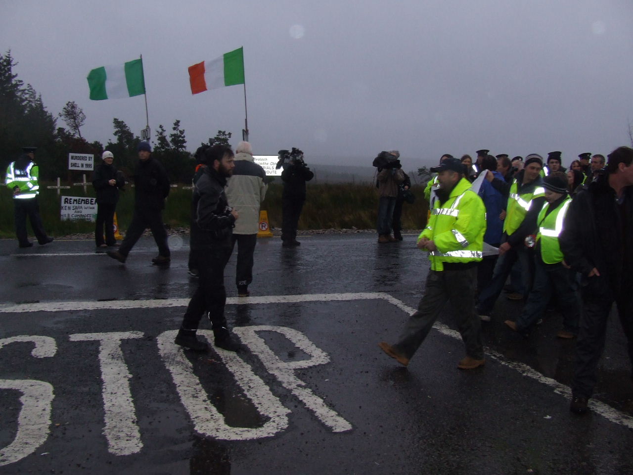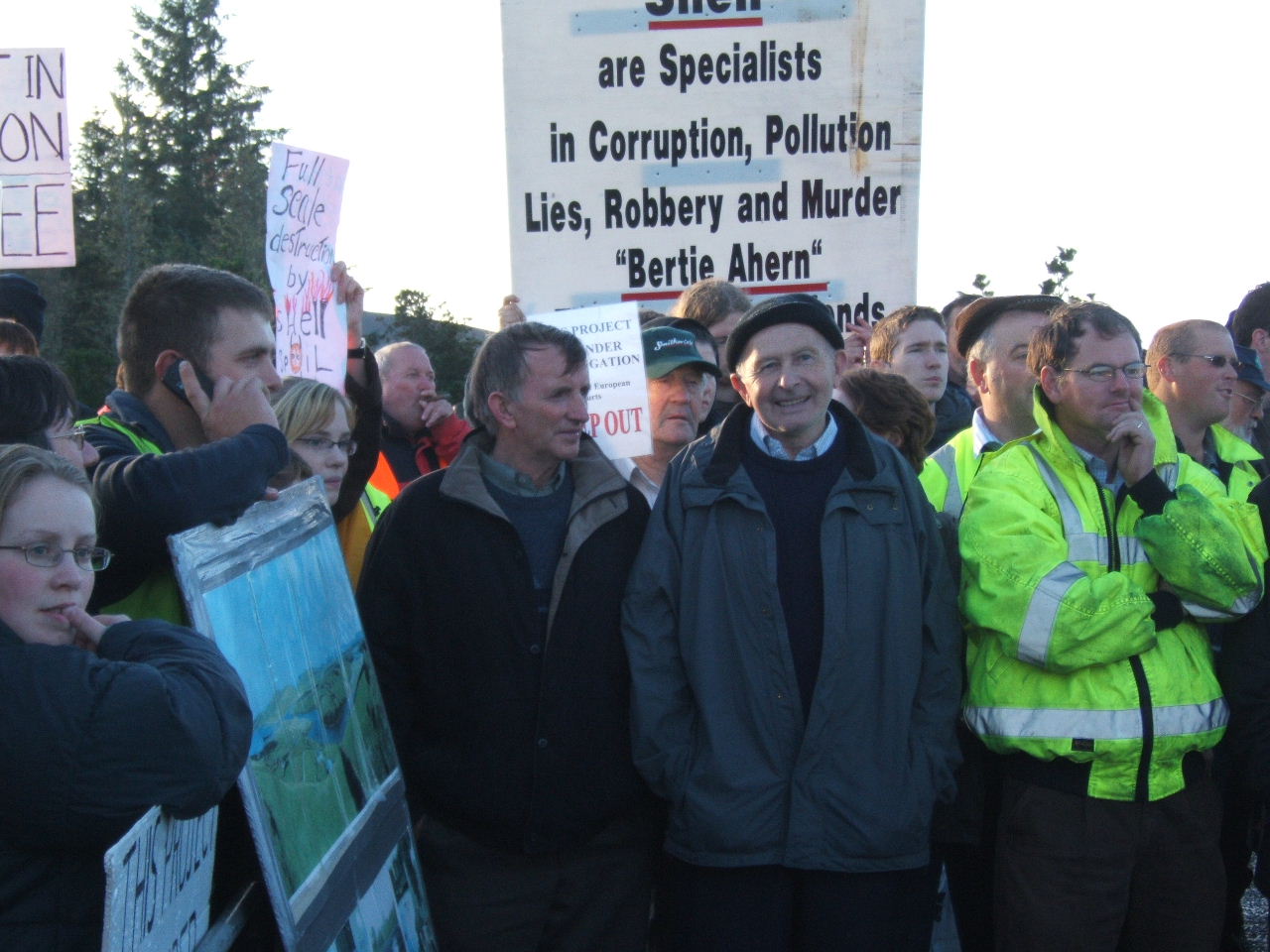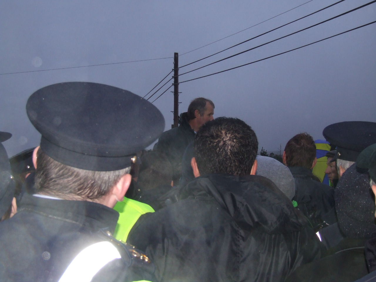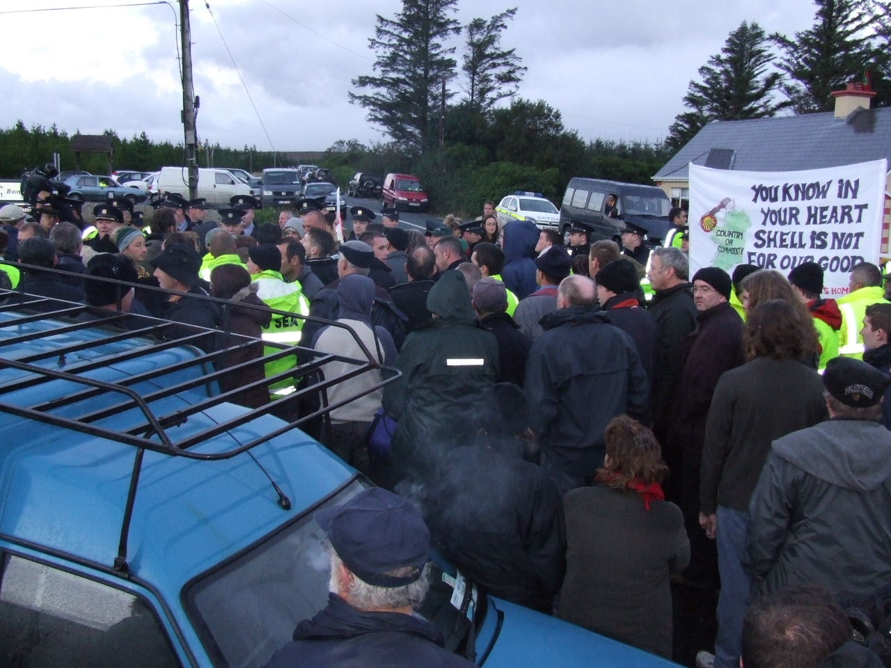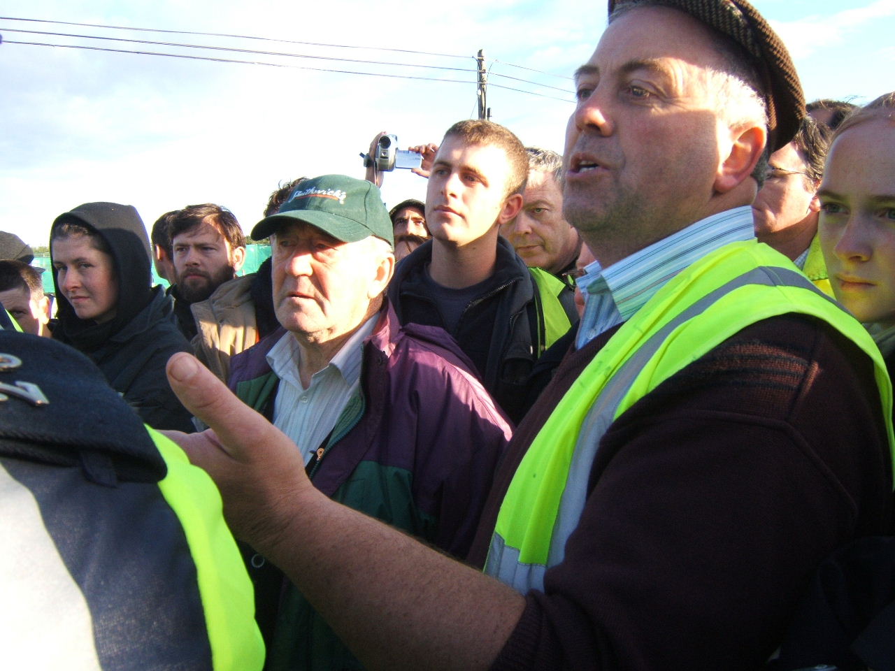 The order was given to push the crowd out of the way of the vehicles. Police formed a line and began to force protesters across the road, forming a crush. In response to the danger posed to some of the younger members of the march, a call went out to give ground to the Garda scrum. When the mass of people had been barged over to one side of the road, the police quickly ushered the Shell convoy past. Once the vehicles had gone into the site the march stopped outside of the gates at the police cordon where Willie Corduff and Jerry Cowley addressed the crowd. They assured the Gardaí that the resistance to this project would continue for as long as it takes and Willie called on people to come and keep coming to the gates of Bellanaboy for the next days, weeks, months and years, if necessary, to ensure that Shell abandon their plans for this onshore refinery and agree to build it at sea.