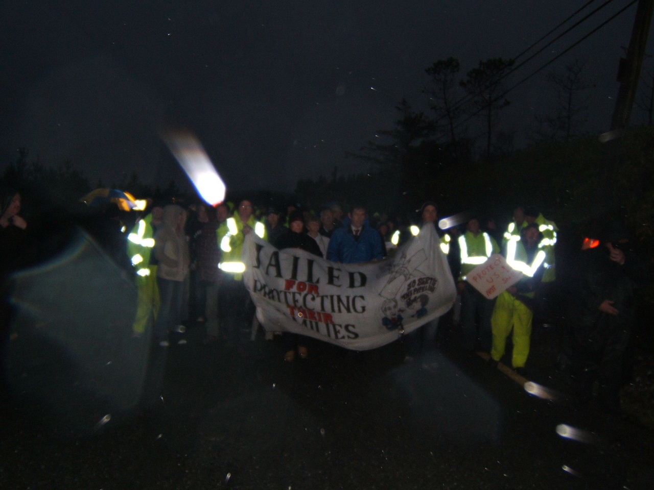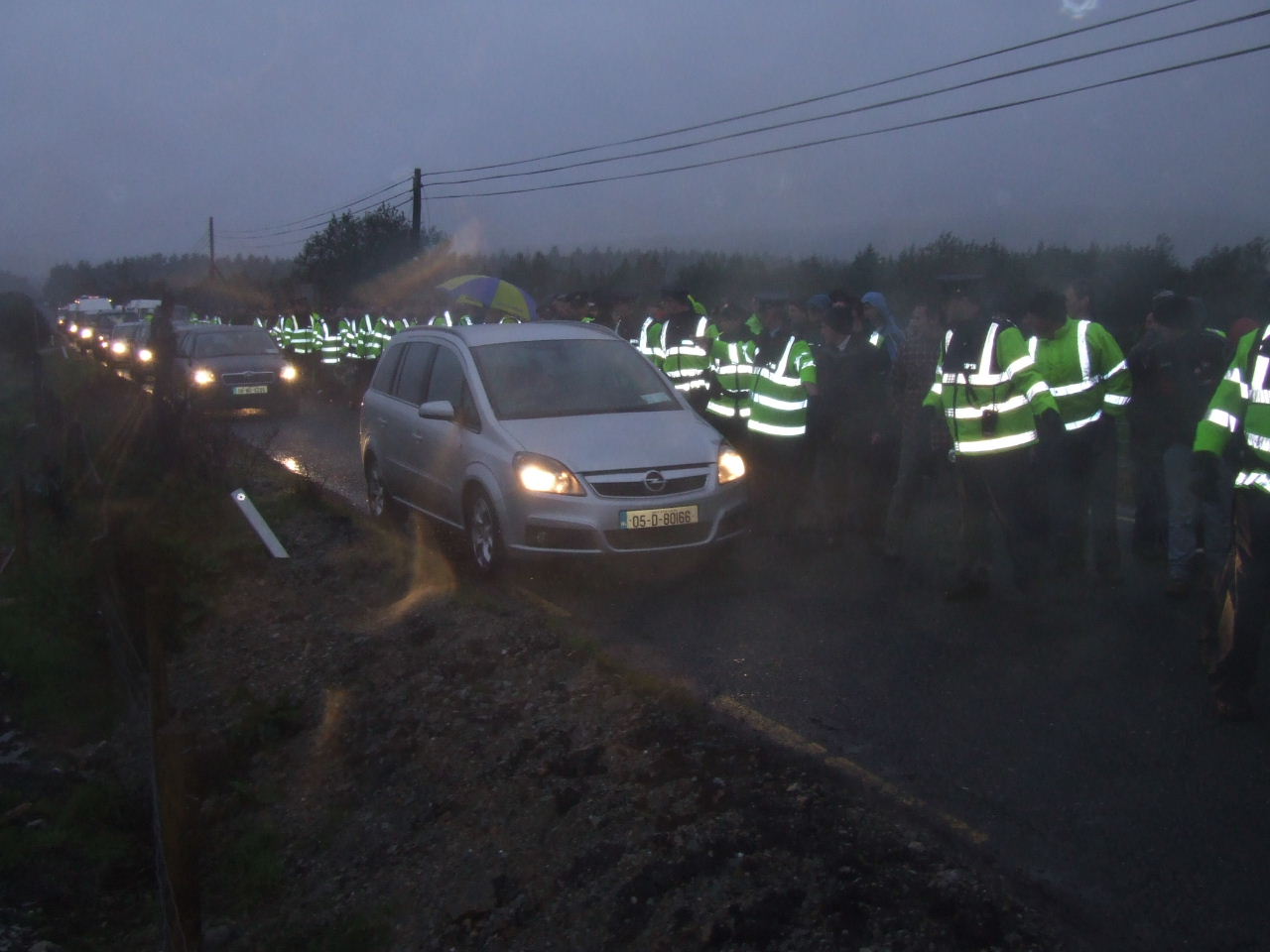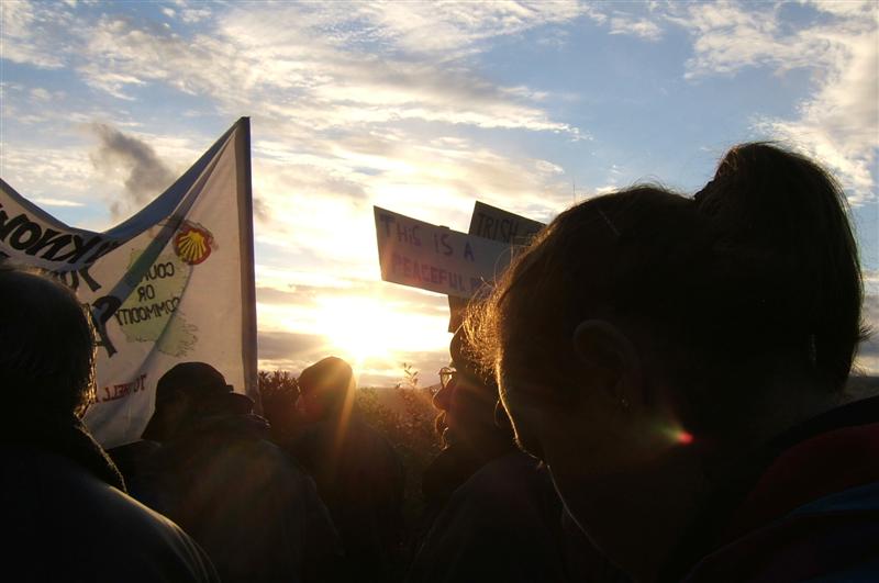 In the wake of Tuesday’s dramatic events outside the gates of Shell’s proposed refinery site at Bellanaboy, campaigners were out in force Wednesday and Thursday undeterred by the heavy police presence and inclement weather. For the last two days over 200 local residents and Shell to Sea activists gathered in the semi darkness of the early mornings to voice their opposition to the Corrib gas project and to underline the fact that although work has temporarily recommenced on site, Shell to Sea resistance to this project will continue. In the face of deliberate attempts by Gardaí to opportunistically provoke and inflame the tempers of the protestors at this sensitive time, the nature of the last few days’ protests has been consciously peaceful, as usual, in an effort to diffuse the tension imported by An Garda Síochána.