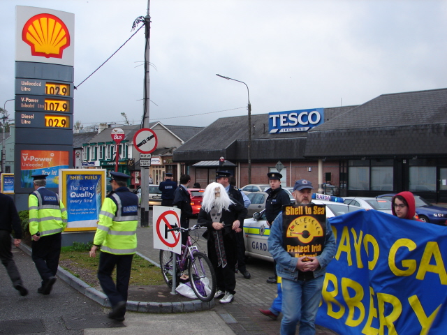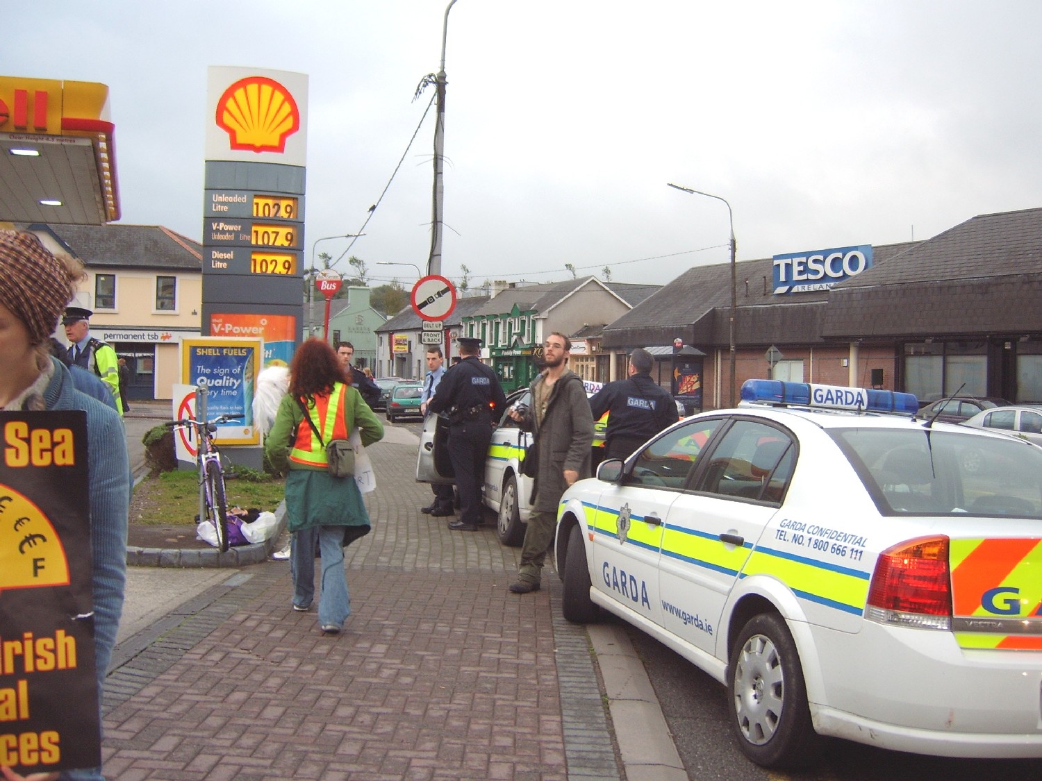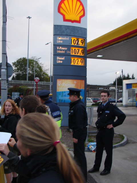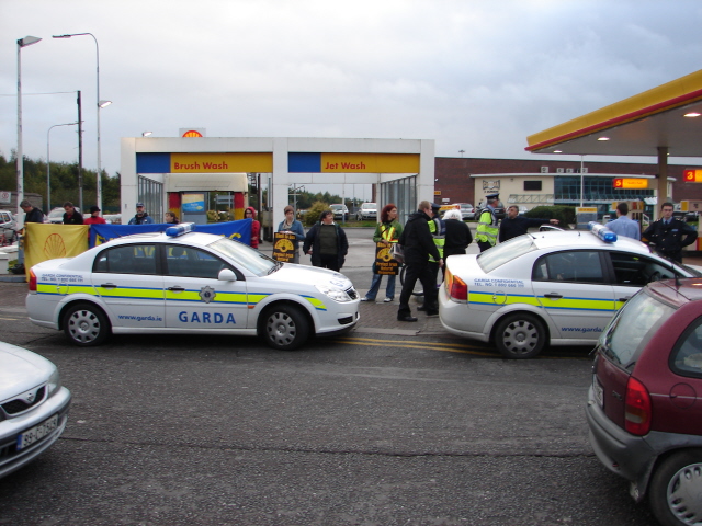 A few minutes later another large car (05-C-17819) came up and after initial hesitation he drove right at the protesters who stood their ground. At least three protesters were carried into the service station on the bonnet of his car. Mr. Road Rage showered us with abuse and announced he was going to call the guards. He filled his car with the filthy Shell fuel and went in to pay for it. Returning to his car he picked up his mobile phone - inside the petrol station ! - and called the Garda Shelldana who arrived minutes later with two patrol cars. An unmarked car pulled in across the street.