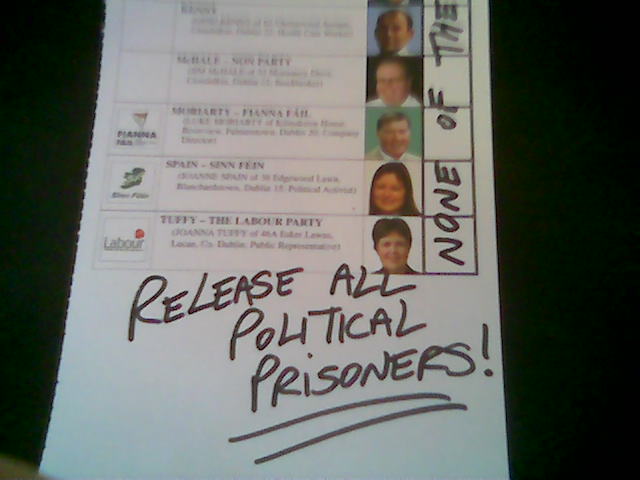 In this election we encourage those of you reading this who are entitled to vote to SPOIL THAT VOTE ! Go to your polling station , claim your vote and deliberately and purposely SPOIL IT ! We ourselves , from this blog , will be writing - " Release All Political Prisoners!" on our voting ballot , but any message you decide to write on your ballot will have the same effect ie that vote will be deemed 'spoiled' .