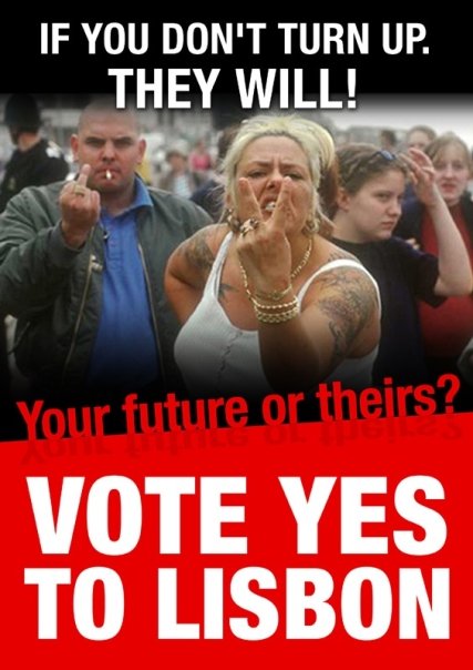 And on the issue of material we all know that the Yes side used a wall, a tsunami of money to hammer their scare-tactics home. They undoubtedly used this ocean of finance to carry out their unpublished research and identify those issues which would demoralise those who turned up to vote No in 2008 and motivate potential Yes voters to show up in 2009. Coir obviously did their homework and put on the Shinner-clothing with the 'They died for your freedom' poster and devoloped their €1:84 poster straight from the findings of the UCD Geary Insitute: http://www.dfa.ie/uploads/documents/ucd%20geary%20insti...t.pdf But how relevant is the arguement over pay and conditions when you've received a paycut, are unemployed or being constantly reminded that your livelihood could simply disappear? Instead of voting against low-wages and long hours people were told that they had the chance to vote for the opportunity work and earn (or to simply keep working) and that if they didn't take the chance now it might never come again. One reason why the reaction against this arguement was slow and patchy was because it was unprepared for and I for one will constantly hammer home the necessity of preparation! http://www.youtube.com/watch?v=sEuuyVPmdhg (Watch as far a 1:09)