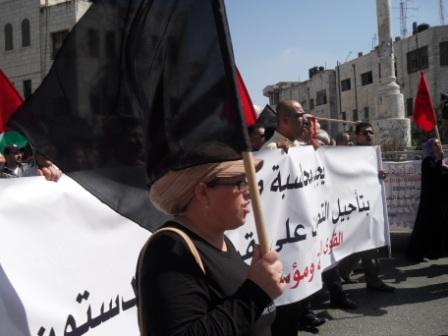 At midday today, Monday 5th October, a demonstration to protest the Palestinian Authority’s action in scuttling the Goldstone Report of the UN Human Rights Council’s Fact Finding Mission to Gaza was held in Ramallah. It had been called over the weekend by a collective of Palestinian civil society including political parties, development organisations, human rights NGOs, and concerned individuals. The demonstration was to give a voice on the streets to the increasing frustration and despair with the unrepresentative and deeply unpopular policies and practices of the Palestinian Authority. (http://www.maannews.net/eng/ViewDetails.aspx?ID=229802 )