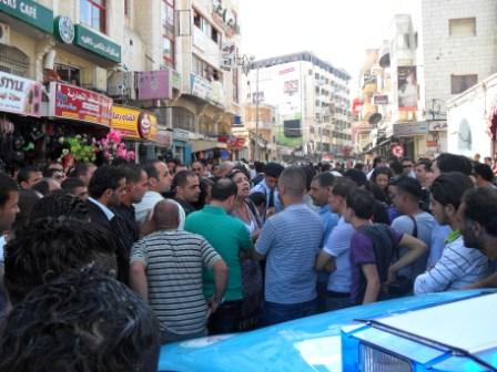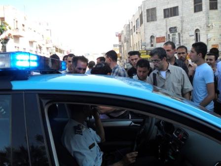 It wasn’t the biggest demo Ramallah has ever seen with perhaps a couple of hundred people. There were chants, speeches, and a fair bit of standing around in al Manara, with a good number of press in attendance. As things began to seem to be ending the crowd from the Orthodox Club arrived bearing black flags and again there were chants, speeches and so on. Representatives of many Palestinian human rights organisations, furious with the betrayal of their ethics and principles by the PA were in attendance. After an hour or maybe less some upstart police officer tried to disperse the crowd on the road by driving through and getting traffic back to normal, thereby ending the demo. His way was blocked by the crowd and his car surrounded. After much arguing and efforts by other plainclothes & uniformed PA forces to get the crowd to disperse he was forced to reverse, a symbolic victory, after which the demo was over.