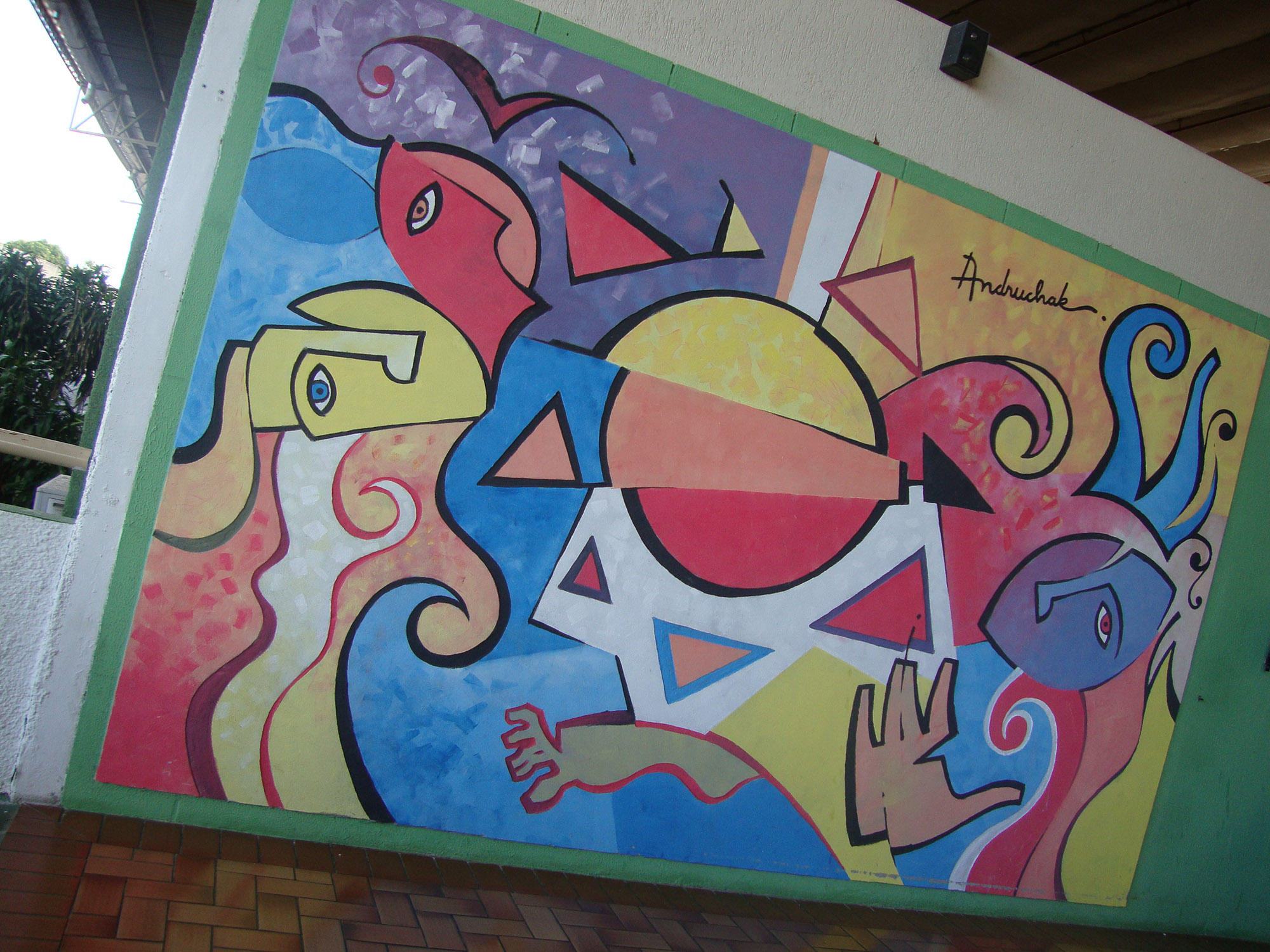 Muralism of Andruchak in Brazil - A mural is a painting on a wall, ceiling, or other large permanent surface.The term became famous with the Mexican muralist art movement (Diego Rivera, David Siqueiros, and José Orozco). There are many techniques of painting or relief. The best-known is probably fresco, which uses water soluble paints with a damp lime wash, a rapid use of the resulting mixture over a large surface, and often in parts (but with a sense of the whole). The colors lighten when dried.